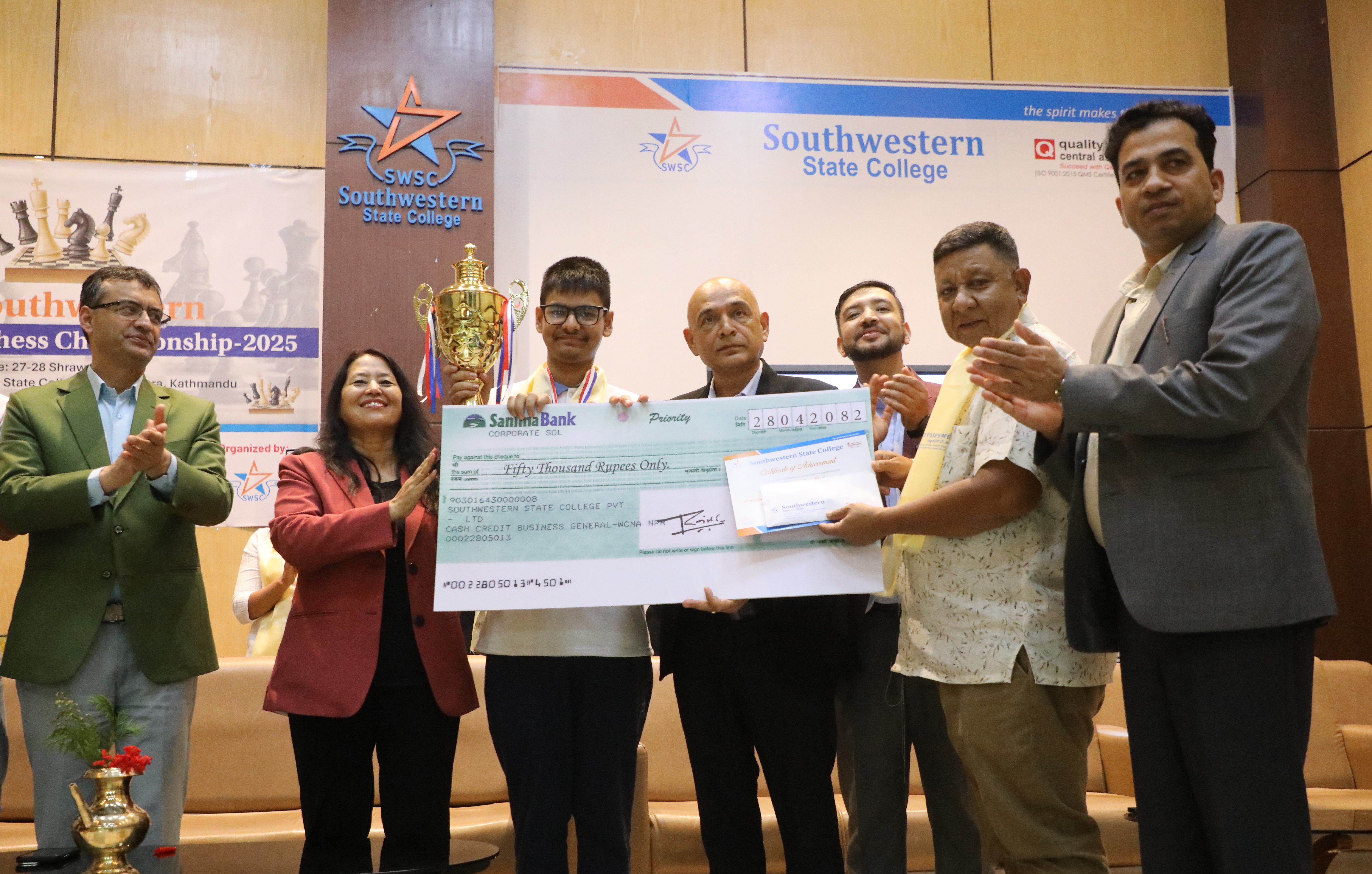 आयोजक साउथ वेस्टर्न स्टेट कलेजका पुरुषोत्तम सिलवालले प्रथम साउथ वेस्टर्न स्टेट अन्तरकलेज बुद्धिचाल प्रतियोगिताको उपाधि बुधबार जितेका छन् ।